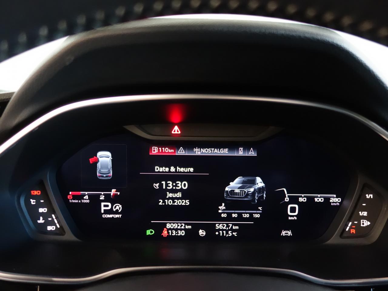 2 prises USB à l’arrière (type-C) et prise 12 volts dans la console centrale arrière2 vestes de sécuritéAccoudoir central coulissant en longueur, avec inclinaison réglable et vide-poches relevableAffichage du contrôle de la pression des pneumatiquesAlerte de franchissement de ligne avec maintien de voieAppel d’urgence Audi connectAppui lombaire à 4 axes pour les sièges avant, réglage électrique, horizontal et verticalAppuie-tête pour sièges avant réglables manuellement en hauteurAssise de banquette arrière coulissante en longueurAudi Drive SelectAudi Hold AssistAudi Parking System PlusAudi pre sense basicAudi pre sense frontAudi virtual cockpitBanquette arrière rabattable 40/20/40Ciel de pavillon en tissu noirClé à fréquence radioClimatisation automatique confort 2 zonesCombiné d’instruments entièrement numérique 10,25 poucesCommande de désactivation d'airbag passager avantDétecteur de pluie et allumage automatique des projecteursDirection assistée électromécanique asservie à la vitesseDossier de banquette AR réglables en inclinaisonEcrous antivolFixation Isofix pour siege passager AVInterface BluetoothJantes en aluminium coulé 5 branches en V, 7 J x 18 avec pneus 235/55 R18MMI navigation plus avec MMI touchPack S line extérieurPack S line intérieurPhares à LED avec clignotants dynamiques à l’arrièreRéception radio numérique (DAB)Réglage de ceinture en hauteur sur les sièges avant, manuelRégulateur de vitesseRétroviseurs extérieurs couleur carrosserieRétroviseurs extérieurs réglables, dégivrants et rabattables électriquement, incluant fonction rabat automatique pour le rétroviseur côté passager avantSièges avant à réglages manuels (en hauteur, longueur et inclinaison)Suspensions sportTrousse de premiers secours avec triangle de signalisationVolant 3 branches multifonction plus en cuir