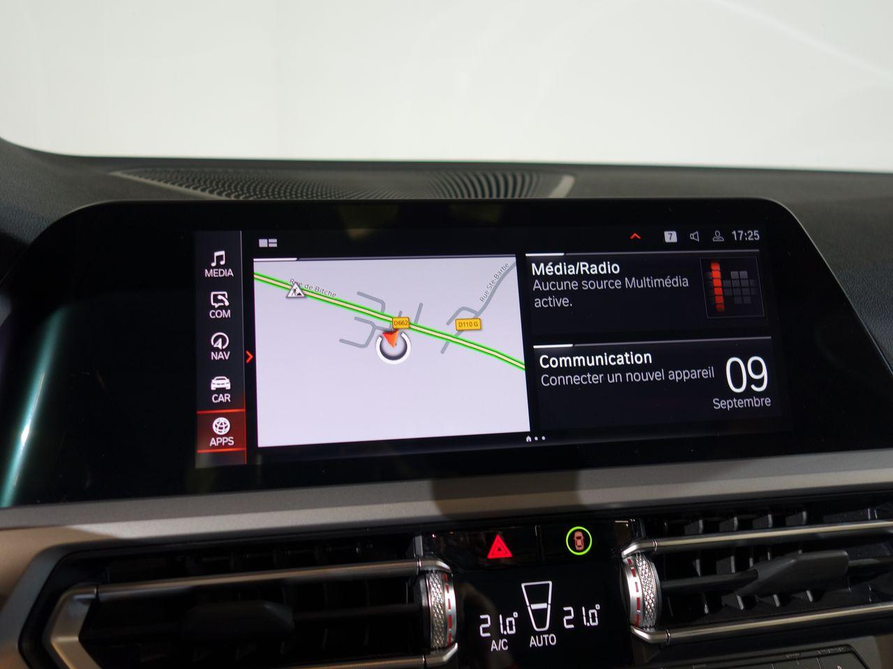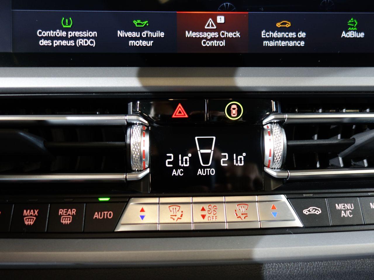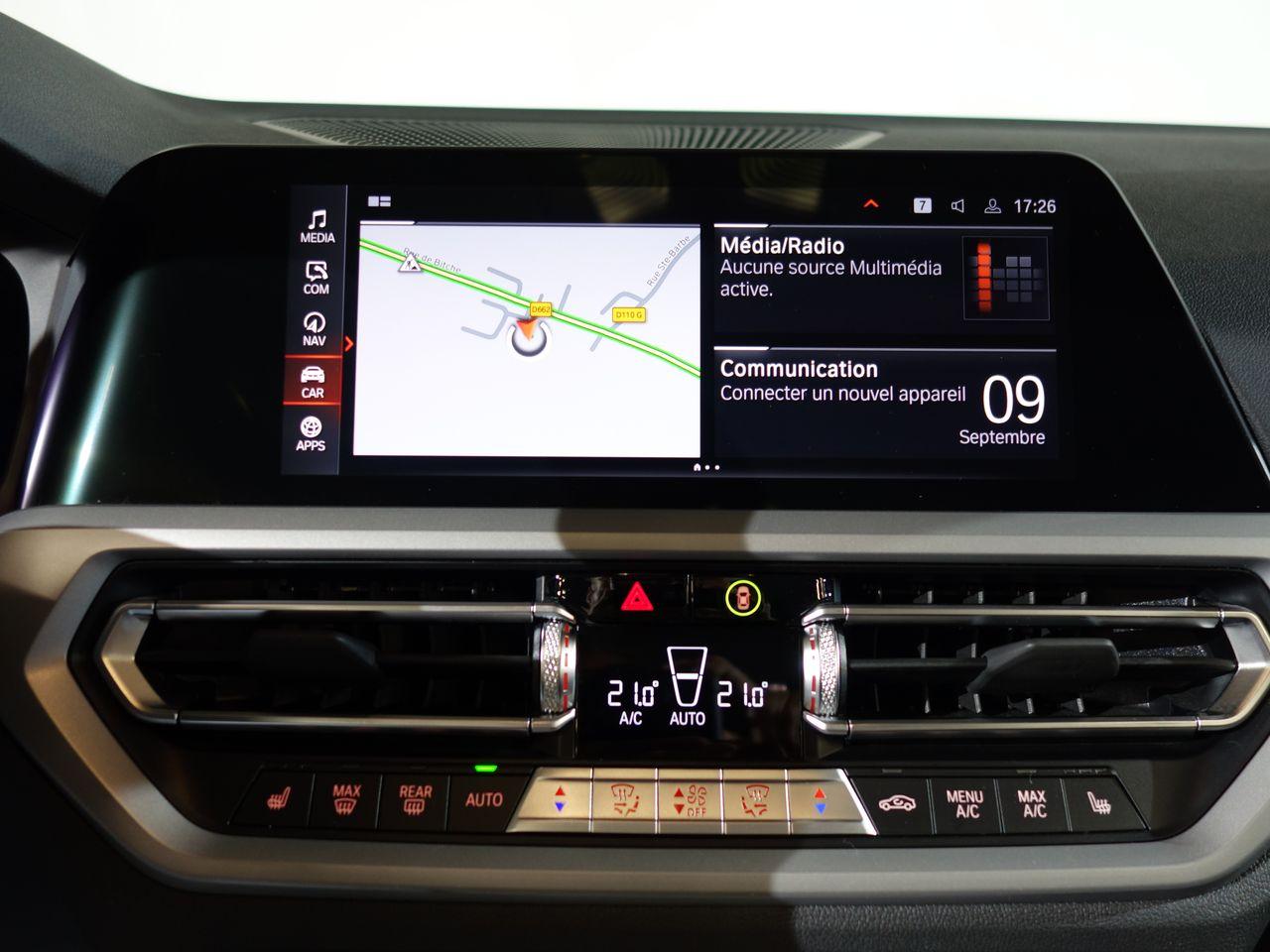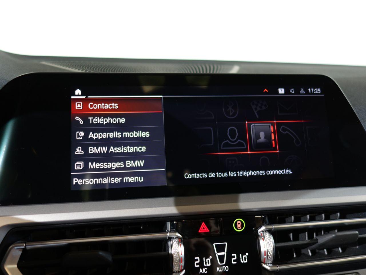Airbags de tête avant et arrière avec voile de protection contre les débris de verreAirbags frontaux AVAirbags latéraux avantAntenne de toit « aileron de requin »Apps VéhiculeAttention Assist : système de détection de somnolenceBaguettes de seuil de portes sigléesBanquette arrière 3 places avec dossiers rabattables en trois parties (40/20/40)BMW Live Cockpit Navigation ProClignotants avant et arrières à LEDClimatisation automatique 3 zones avec filtre microporeux et fonction de recyclage d'airContrôle Dynamique de la Stabilité DSC+ avec fonctionnalités étenduesContrôle Dynamique de la Traction DTCFeux arrière à LEDFeux arrière antibrouillard à LEDFeux de jour à LEDFixations ISOFIX aux places latérales arrières pour sièges enfantJantes 17" style 775 rayons en V bicoloresKit rangementPack Connected ProPortes arrière avec sécurité enfantRadars de stationnement avant et arrière PDCRétroviseur intérieur anti-éblouissementRétroviseurs extérieurs dégivrantsRétroviseurs extérieurs rabattables électriquement et électrochromatique du côté conducteurSélecteur de mode de conduite - 3 modes : "ECO PRO", "Confort" et "Sport"Sièges conducteur et passager réglables en hauteur et inclinaison du dossierSystème de haut-parleurs Hi-FiTuner DABVerrouillage centralisé avec télécommandeVitrage teinté pour réduire l'échauffement dû à l'ensoleillementVitres avant et arrière électriques à impulsion avec système ant-ipincementVolant sport 3 branches gainé de cuir