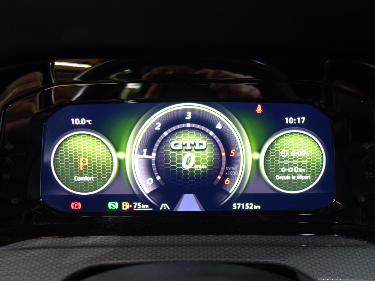 2 interfaces USB-C à l'avant et 2 prises de chargement USB-C derrière l’accoudoir pour les passagers arrière2 spots de lecture à l'avant et à l'arrière7 haut-parleursAccoudoir central arrière rabattable et deux porte-gobeletsAccoudoir central avant réglable en hauteur et en profondeur avec compartiment de rangementActivation automatique des feux de détresse en cas de freinage d'urgenceAirbags conducteur et passagerAirbags de «tête» passagers avant et arrièreAirbags latéraux avantAlerte de perte de pression des pneusAntipatinage électronique ASRApp-Connect sans filApplications décoratives "Black Metal Chrome" pour le tableau de bord et les revêtements de portes à l'avantAppuis-tête AV et AR réglables en hauteurAssistance au contrebraquageAssistance au freinage d'urgenceAssistant de changement de trajectoire "Side Assist"Badges GTD sur les ailes avant et inscription GTD sur le hayonBaguette lumineuse entre les projecteursBanquette arrière rabattable 2/3 - 1/3 avec trappe à skisBlocage électronique de différentiel EDSCache-bagages amovibleCeintures de sécurité automatiques avant trois points à enrouleur, réglables en hauteur, avec prétensionneursCiel de pavillon noir soulClimatiseur "Air Care Climatronic" 3 zones et filtre anti-allergène et éléments de commandes à l'arrièreCompartiment de rangement et prise 12 V à l' AVCorrecteur électronique de trajectoire ESPDigital Cockpit Pro : combiné d’instruments digital avec écran digital haute résolution couleur de 10.25”Direction progressiveDisques de frein 17” à l'avant et à l'arrièreDouble sortie d'échappement chromée à gaucheE-call : Appel d’urgence manuel ou automatiqueEclairage à LED de la plaque d'immatriculation arrièreEclairage d'ambiance - 30 couleurs et éclairage de plancher à l'avantEclairage d'ambiance extérieur : poignées de portes éclairées et éclairage périmétrique avec projection du logoEclairage de plancher à LED à l'avant avec possibilité de sélectionner la couleur d'éclairageEcran tactile 10’’Etriers de frein rouge à l'avant et à l'arrièreFatigue Detection : Système de détection de fatigue du conducteurFeu arrière de brouillard d’un côté, feux de recul des deux côtésFixation pour siège enfant ISOFIX (arrière, x2)Frein de stationnement électromécanique avec fonction d’immobilisation en pente ‘Auto hold’ et assistant de démarrage en côteFront assist avec freinage d’urgence et détection de piétonsIndicateur de température extérieure avec avertisseur de gelInterface Bluetooth pour téléphone portable (mains-libres)Interface téléphonique avec fonction de charge inductiveKit de dépannage : compresseur 12 volts et produit d'étanchéité de pneuLave-essuie-glace arrière à balayage intermittentLimiteur de vitesseLiseré gris argent dans la calandre et les projecteursMesures supplèmentaires de protection des piètonsMiroirs de courtoisie éclairés intégrés aux pare-soleilPack visibilitéPare-chocs avant et arrière spécifiques GTD, prise d’air en structure nid d’abeilles à l’avantParkPilot : Système d’aide au stationnement avant/arrière avec signaux sonores et visualisation de la distance des obstacles sur l’écranPédalier et repose-pied en acier inoxydable brosséPoignées de portes couleur carrosseriePréparation We Connect et We Connect PlusPrise 12V dans le coffreProjecteurs antibrouillard dans le bouclier avant et feux de braquageProjecteurs IQ.Light - Matrix LEDProtection antidémarrageRear Assist : Caméra de recul avec visualisationRéception radio numérique DAB+Régulateur électronique de couple MSRRépartiteur électronique de freinage EBVRétroviseur intérieur électrochromeRétroviseurs extérieurs couleur carrosserieRétroviseurs extérieurs rabattables et réglables électriquement, avec fonction mémoire et dégivrage séparéRevêtement de porte et latéral en feuille de mousse et tissuSélection du profil de conduiteSellerie tissu ‘Scale Paper’Service d’appel d’urgence (inclus 10 ans et disponible indépendamment de l’inscription dans le système d’infotainment)Siège du conducteur avec réglage en hauteurSiège passager réglable manuellement en hauteurSièges sport à l’avant spécifiques GTD avec appuis-tête intégrés et appuis lombaires à l’avantSign Assist: Reconnaissance des panneaux de signalisation et affichage sur le ‘Digital Cockpit’ et l’écran du système de radionavigationSystème d'antiblocage des roues ABSSystème de Freinage anti-multicollisionSystème Navigation & Infotainment ‘Discover Media’ avec «Services de streaming et radio via Internet»Système Start/ Stop avec récupération d'énergie de freinageTapis de sol avant et arrièreTechnologie Car2XTémoin et alerte sonore de non-bouclage des ceintures de sécurité avant et arrièreTrains roulants sportVerrouillage centralisé avec télécommande à fréquence radio par clé rétractableVitres avant et arrière électriquesVolant réglable en hauteur et en profondeurVolant sport multifonction en cuir spécifique GTD avec commandes tactiles, retour haptique et palettes au volantXDS : Système agissant comme un différentiel autobloquant électronique permettant une meilleure motricité en courbe grâce à une répartition optimale de la puissance et du couple sur les roues avant